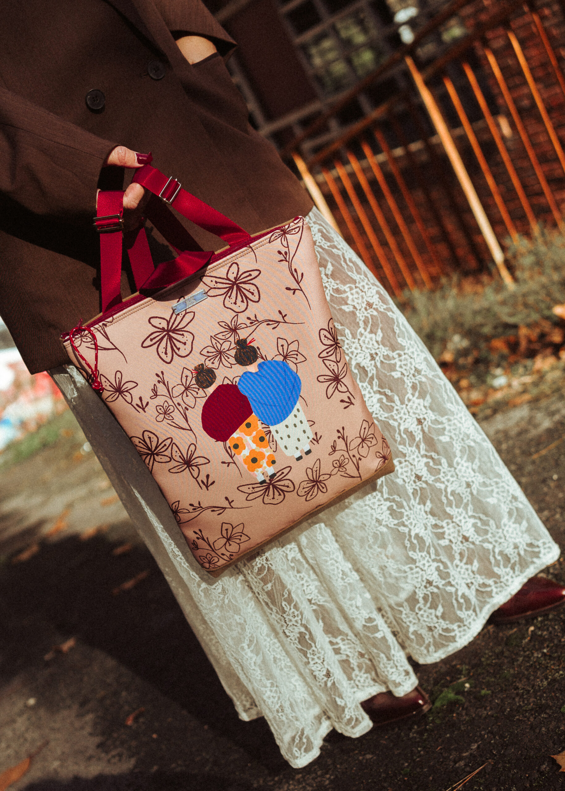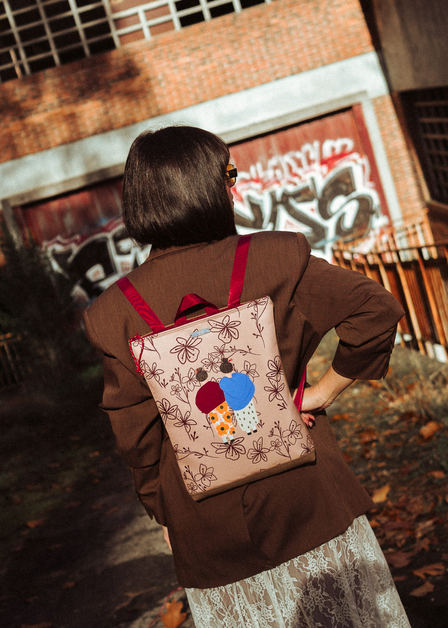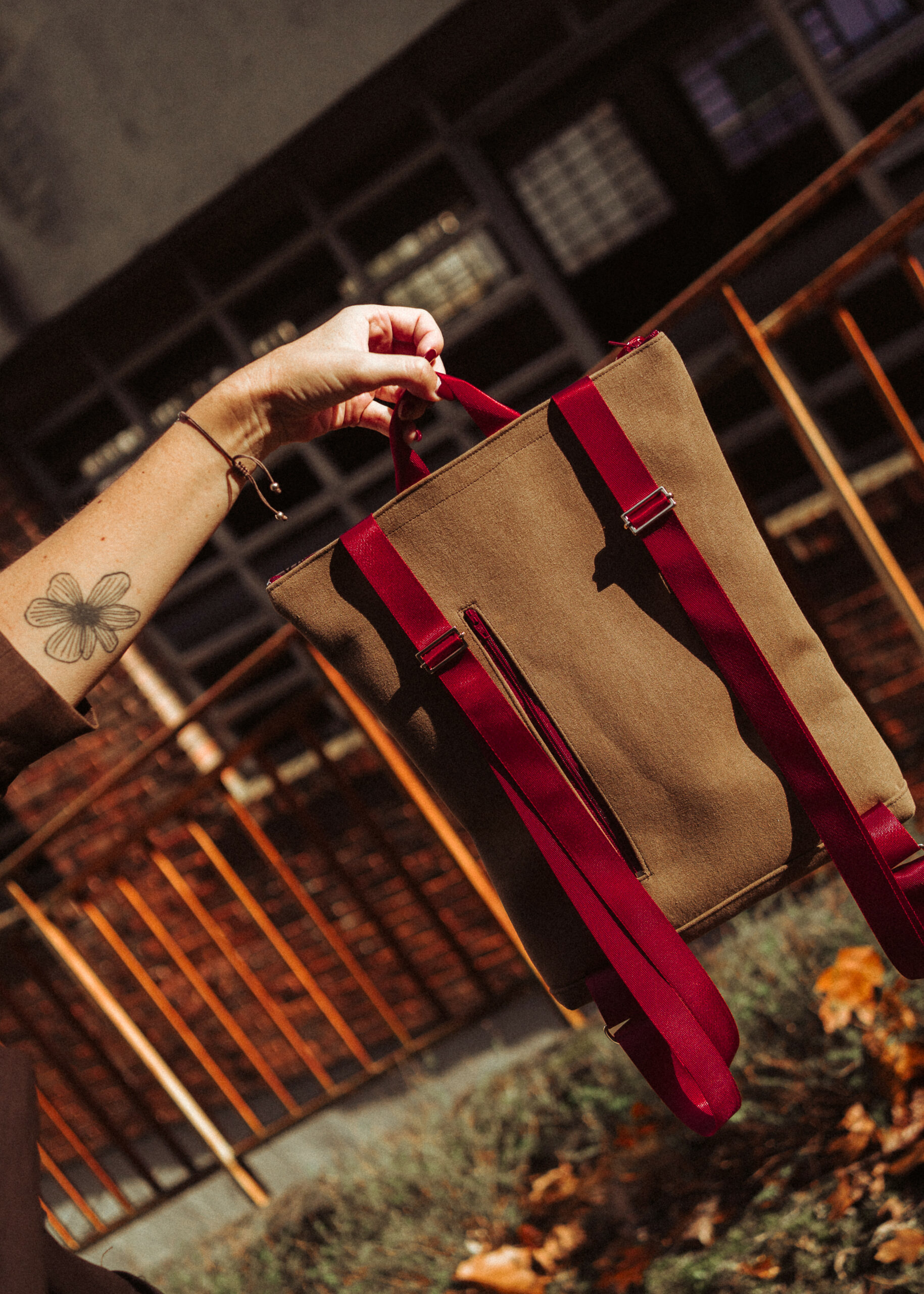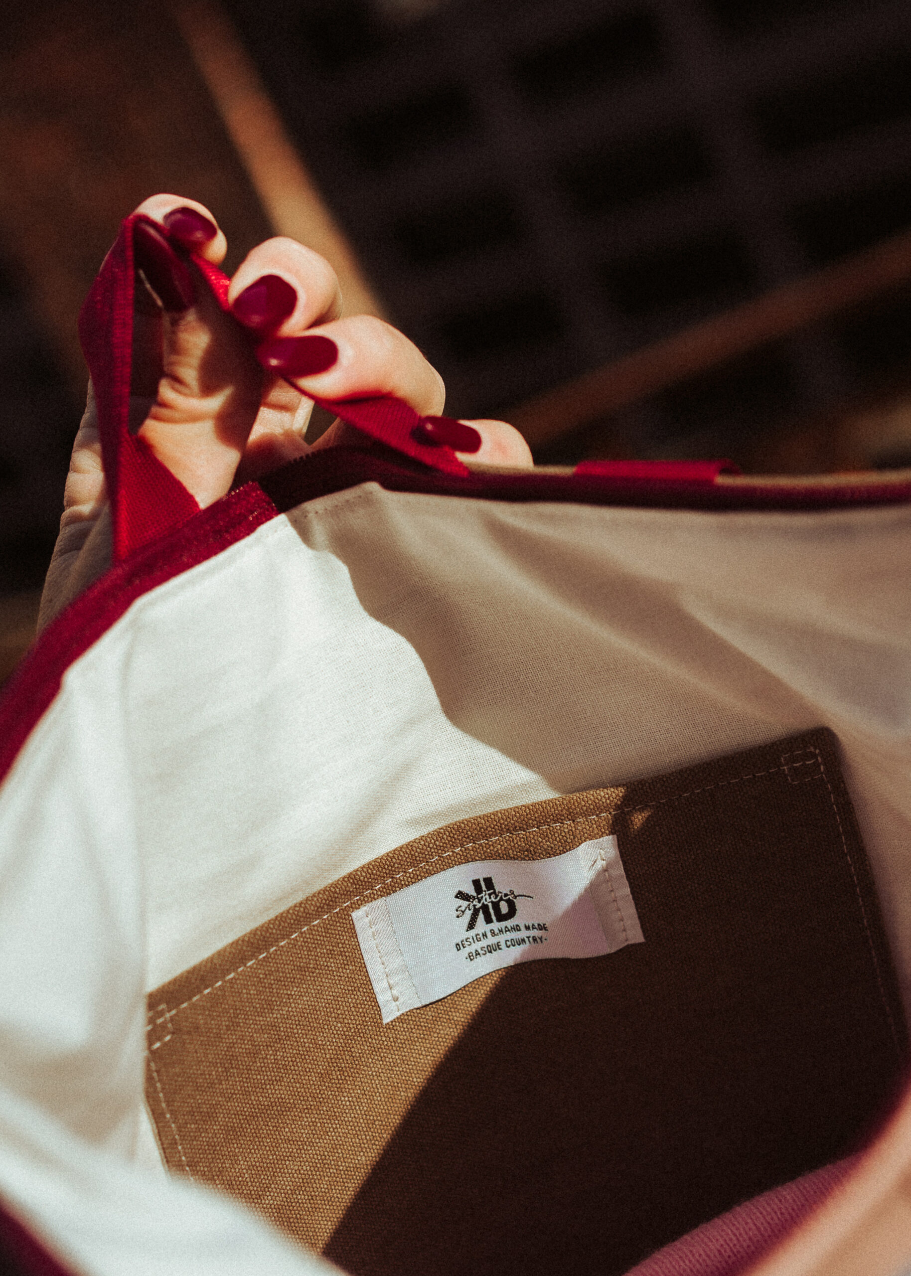 Composición: tela sarga fina, loneta de tejido RECICLADO, Forro de algodón, correa de nilon, herrajes de metal y LOGO impreso en 3D con un biomaterial de origen vegetal lo que le hace biodegradable y compostable.