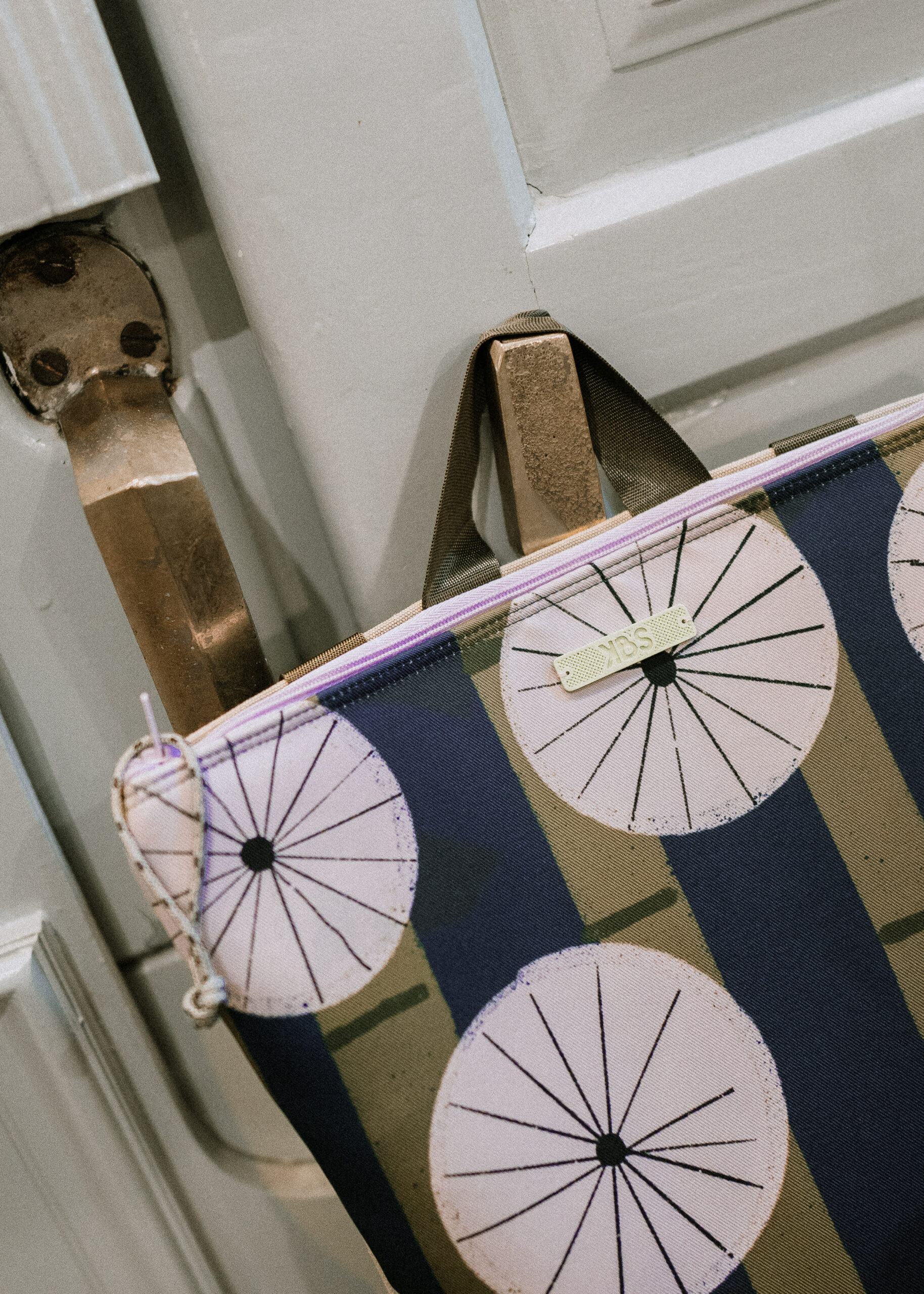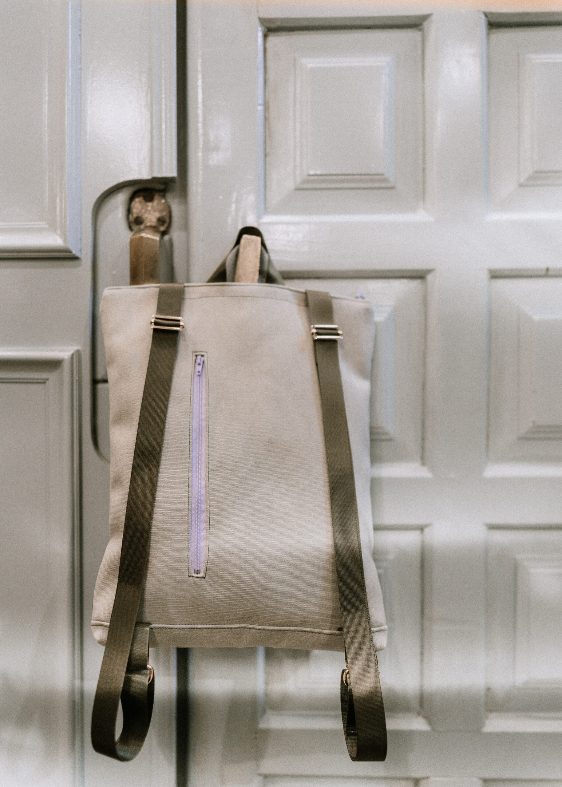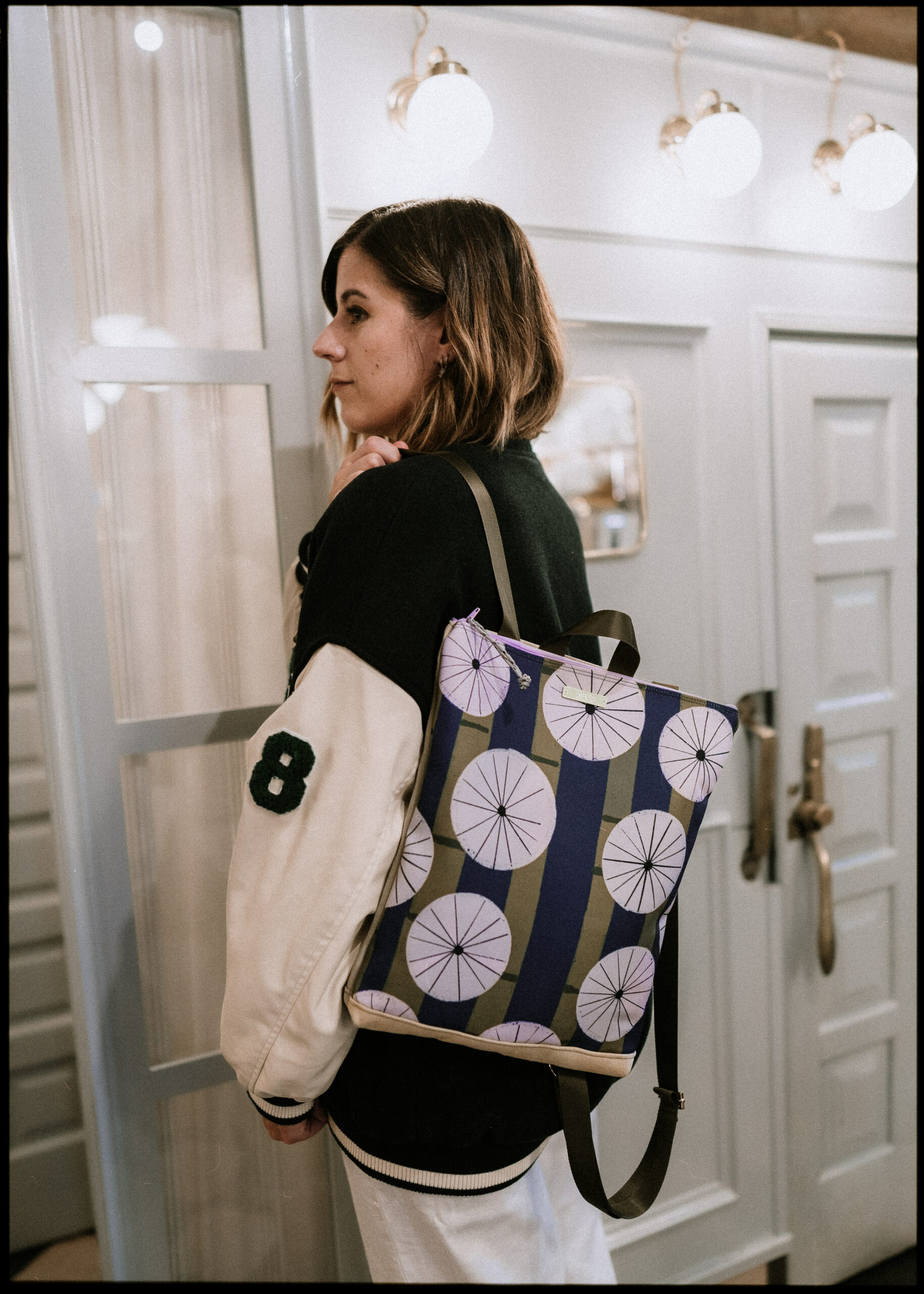 Composición: tela sarga fina, loneta de tejido RECICLADO, Forro de algodón, correa de nilon, herrajes de metal y LOGO impreso en 3D con un biomaterial de origen vegetal lo que le hace biodegradable y compostable.